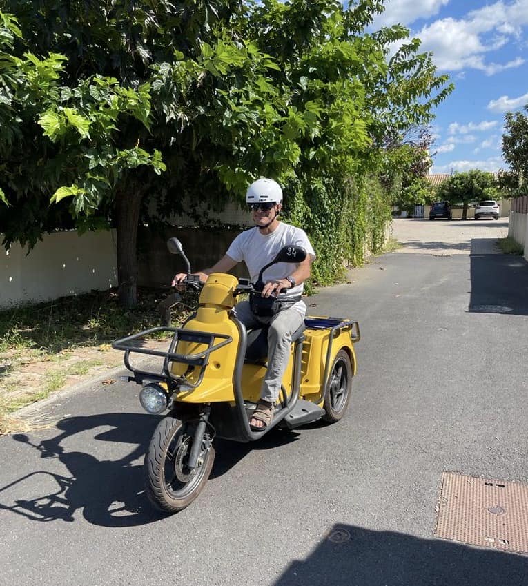Nous avons acheté un LIGIER Pulse 3 d’occasion à la Poste, et nous nous en servons pour déposer nos colis à la Poste. Entre le trajet maison-atelier en vélo et atelier-la Poste en tricycle électrique, notre bilan carbone diminue…