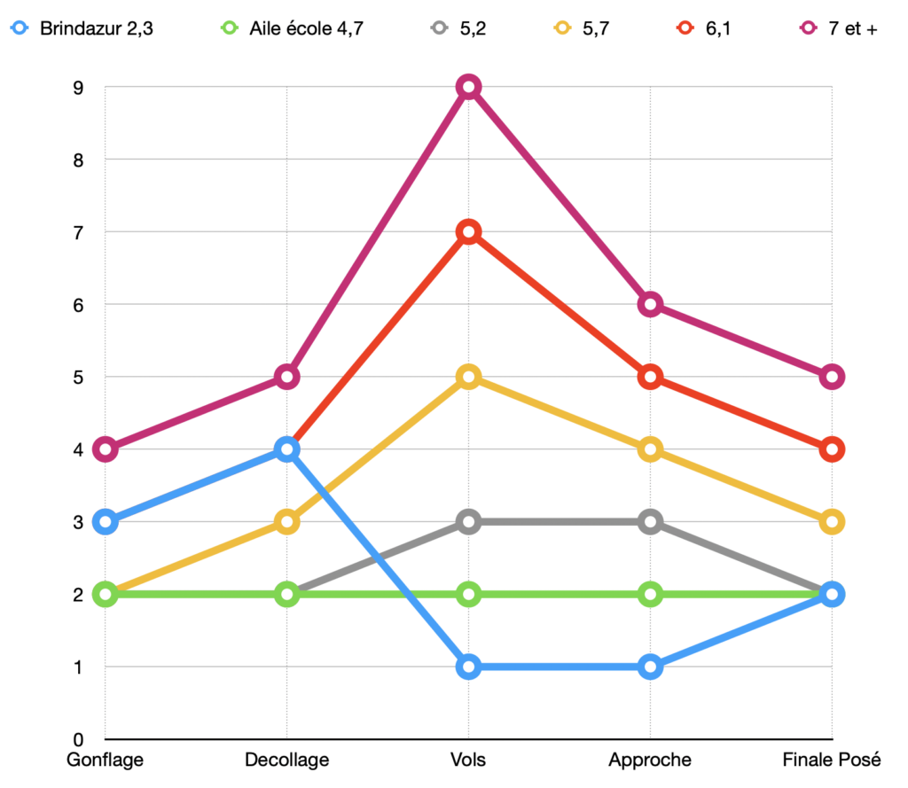 J’ai considéré qu’une aile école (courbe verte) avait un niveau d’exigence de 2 sur toutes les phases et j’ai ensuite positionné les autres voiles avec les niveaux tels que je les estimes.